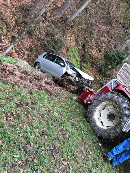 Das Fahrzeug grub sich im Graben mit der Front in den Morast ein, und kam leicht seitlich liegend in einem kleinen Bach zum stehen. Aufgrund der schwierigen Situation am Unfallort, musste die Feuerwehr über eine Aluschiebeleiter zur Verunfallten hinabsteigen.