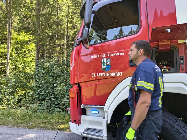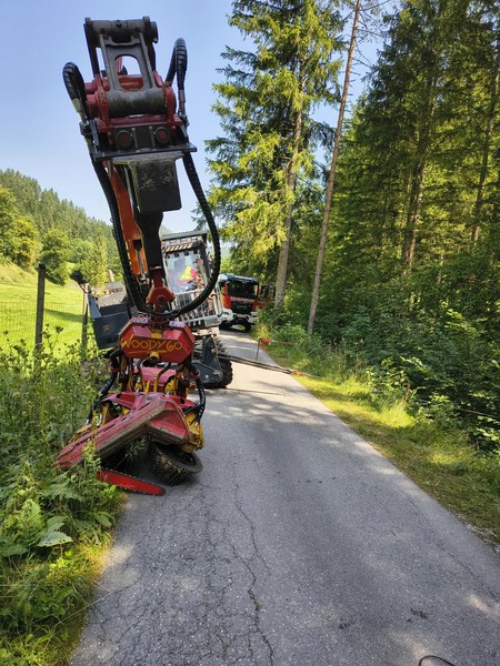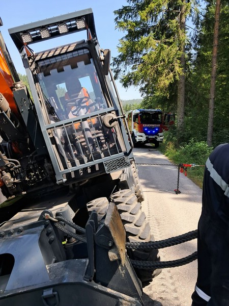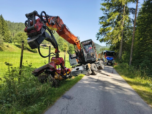 Am 13.08.2025 um 12:07 Uhr wurde die FF-St. Aegyd zu einer „Bergung – Großfahrzeug“ alarmiert. Ein Radbagger mit Ausleger ist aus ungeklärter Ursache auf das Bankett gekommen und konnte mit eigenen Mitteln nicht mehr auf die Straße manövriert werden.