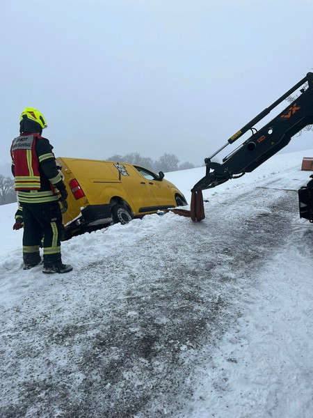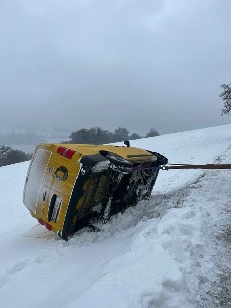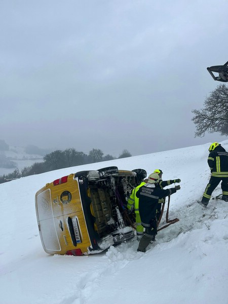 Das Fahrzeug ist auf schneeglatter Fahrbahn abgerutscht und kam auf der Seite liegend auf einer Wiese zu liegen.