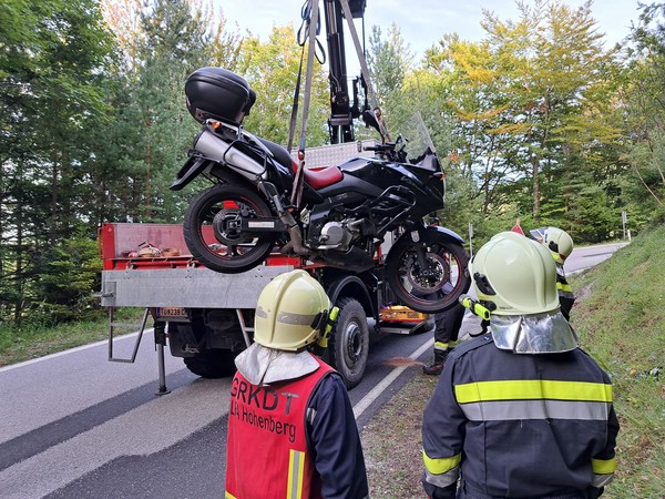 Am 21. September 2025 wurde die Freiwillige Feuerwehr Hohenberg zu einem T1 – Bergung eines Kleinfahrzeuges (Motorrad) mit Austritt von Betriebsmitteln alarmiert. Bereits auf der Anfahrt begegneten wir dem Rettungsfahrzeug, das den leicht verletzten Motorradlenker ins nächstgelegene Krankenhaus brachte.