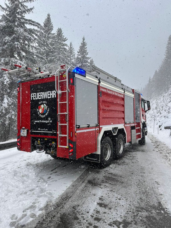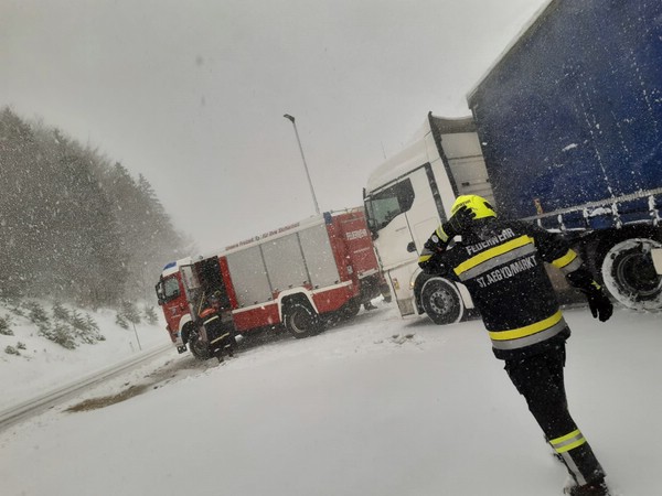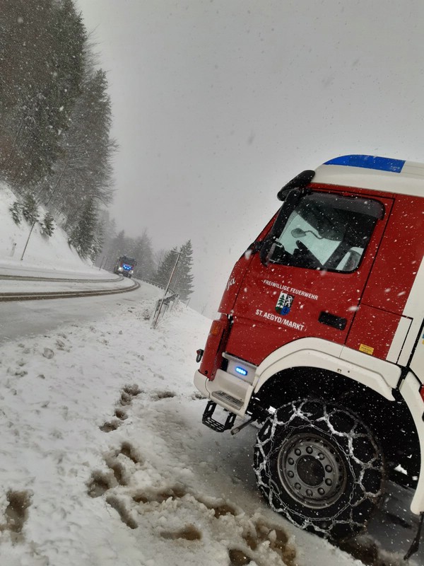 Aufgrund der Zusatzinformation „mehrere hängengebliebene Fahrzeuge“ rückte die FF St. Aegyd mit zwei Fahrzeugen aus. Da es sich um zwei Einsatzstellen handelte, wurden die Bergungen zeitgleich durchgeführt, um beide Fahrspuren so rasch wie möglich wieder frei zu bekommen. Die Sattelkraftfahrzeuge wurden auf die Passhöhe geschleppt und abgestellt.